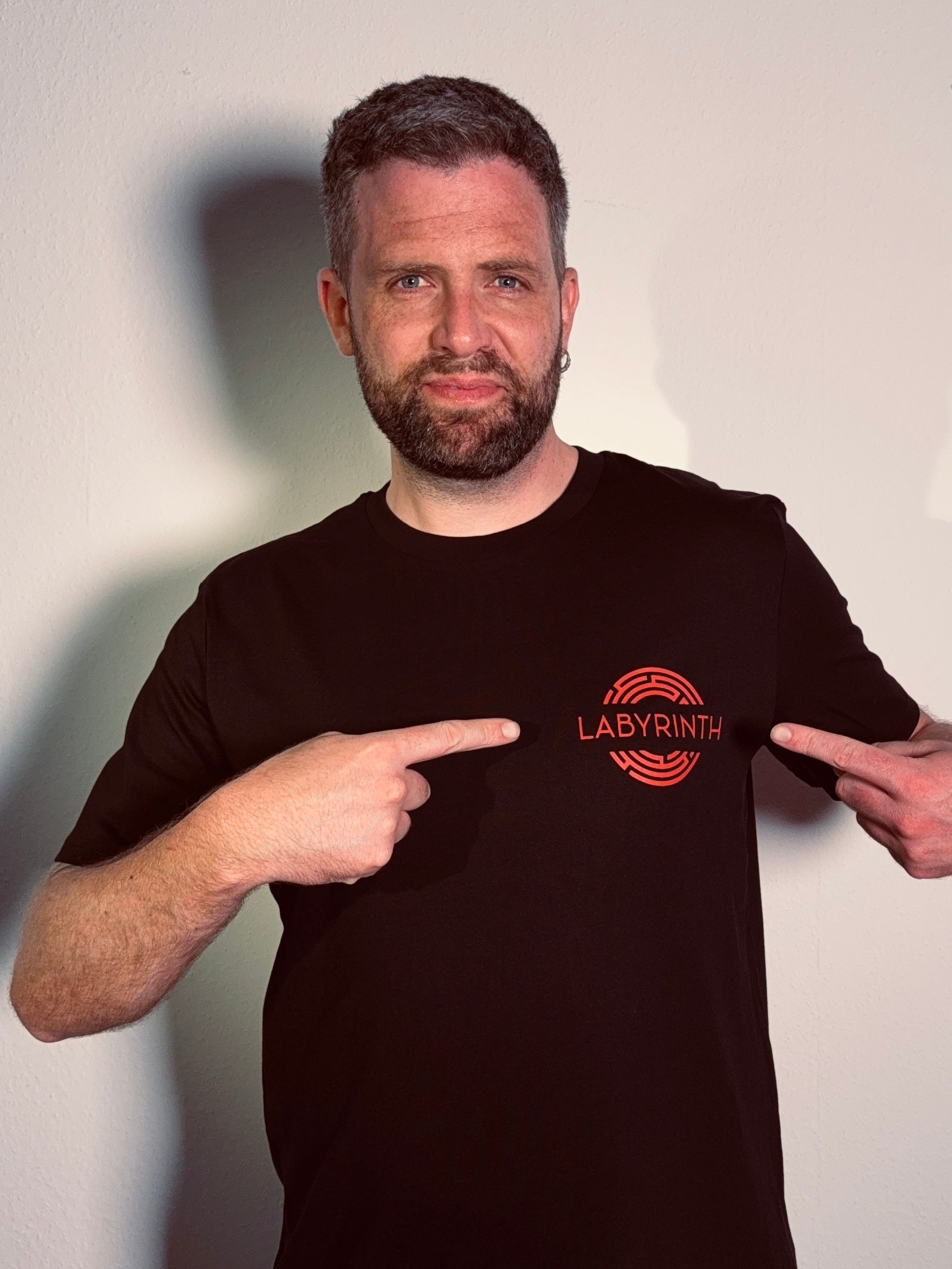 Auf der Brust das runde Labyrinth-Logo – auf dem Rücken der Schriftzug in voller Breite.